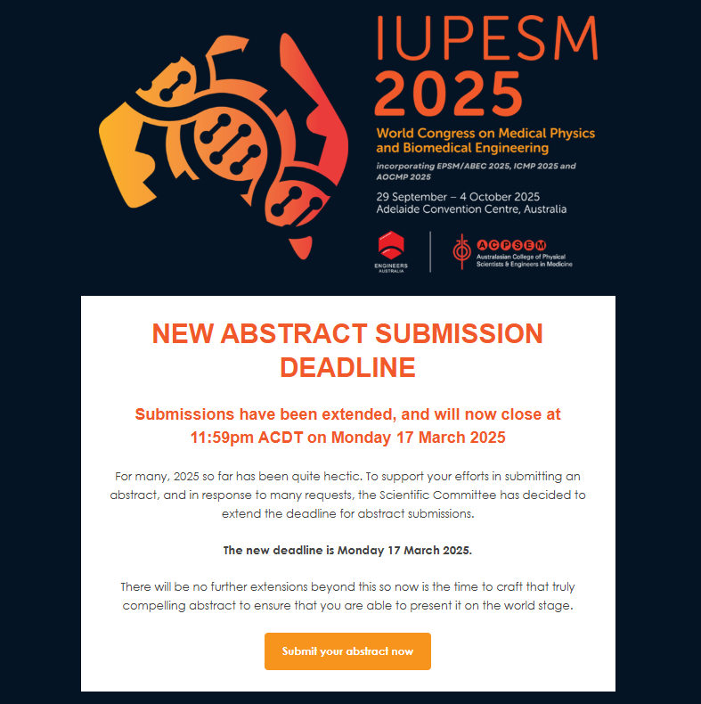 Link: Abstract Submissions | IUPESM World Congress on Medical Physics and Biomedical Engineering 2025